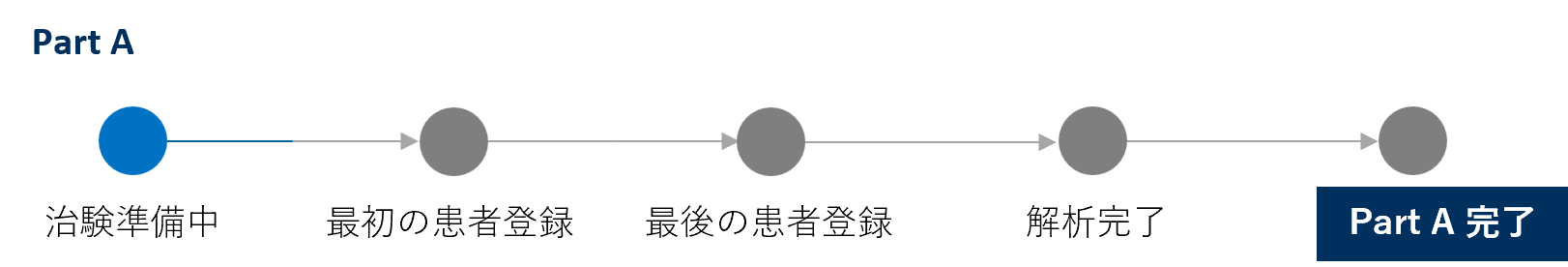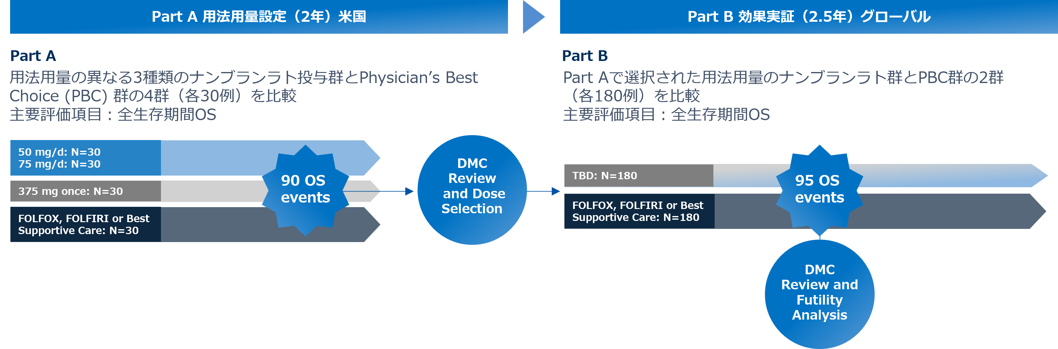 - Part Aでは、用法・用量設定を目的に、用法用量の異なる3種類のナンブランラト投与群とPhysician’s Best Choice(PBC)群の4群(各30例)を比較。