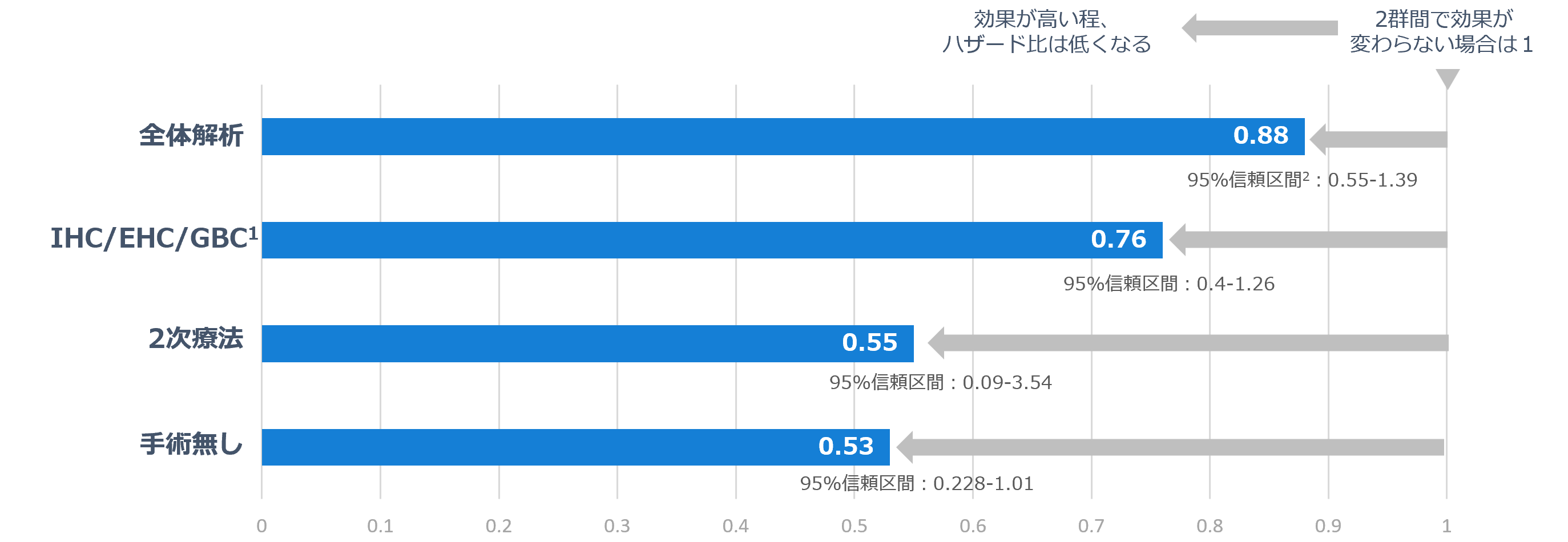直近では、ESMO Congress 2025において、全生存期間(OS)のサブグループ解析結果がポスター発表されました。本発表のサブグループ解析では、胆道がんのサブタイプのうち十二指腸乳頭部がん(欧米においては胆道がんに含まれない)を除く3つのサブタイプを対象とした解析においてハザード比=0.76(95%信頼区間:0.40–1.26)を示しました。加えて、2次療法患者群のみ(3次療法以降の患者群を除外)に限定した解析ではハザード比=0.55(95%信頼区間:0.09–3.54)、手術未実施患者群ではハザード比=0.53(95%信頼区間:0.228–1.01)と、良好なOS改善効果が確認されました。