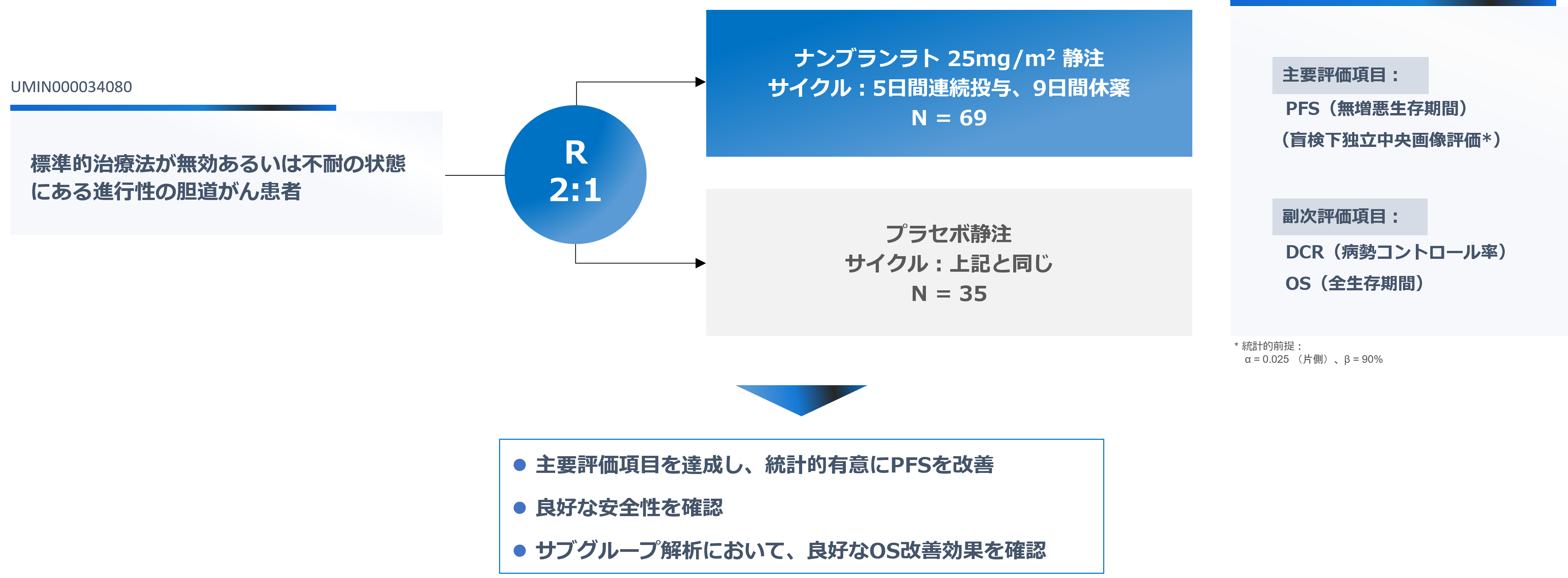 2023年1月に開催されたASCO GI 2023(米国臨床腫瘍学会・消化器がんシンポジウム)において、ナンブランラトが前治療歴のある進行性・難治性胆道がん患者に対し、無増悪生存期間(PFS)でプラセボ群に対して統計学的有意差を示し、主要評価項目を達成した結果が口頭発表されました(ハザード比=0.56、95%信頼区間:0.34–0.90、p=0.02)。