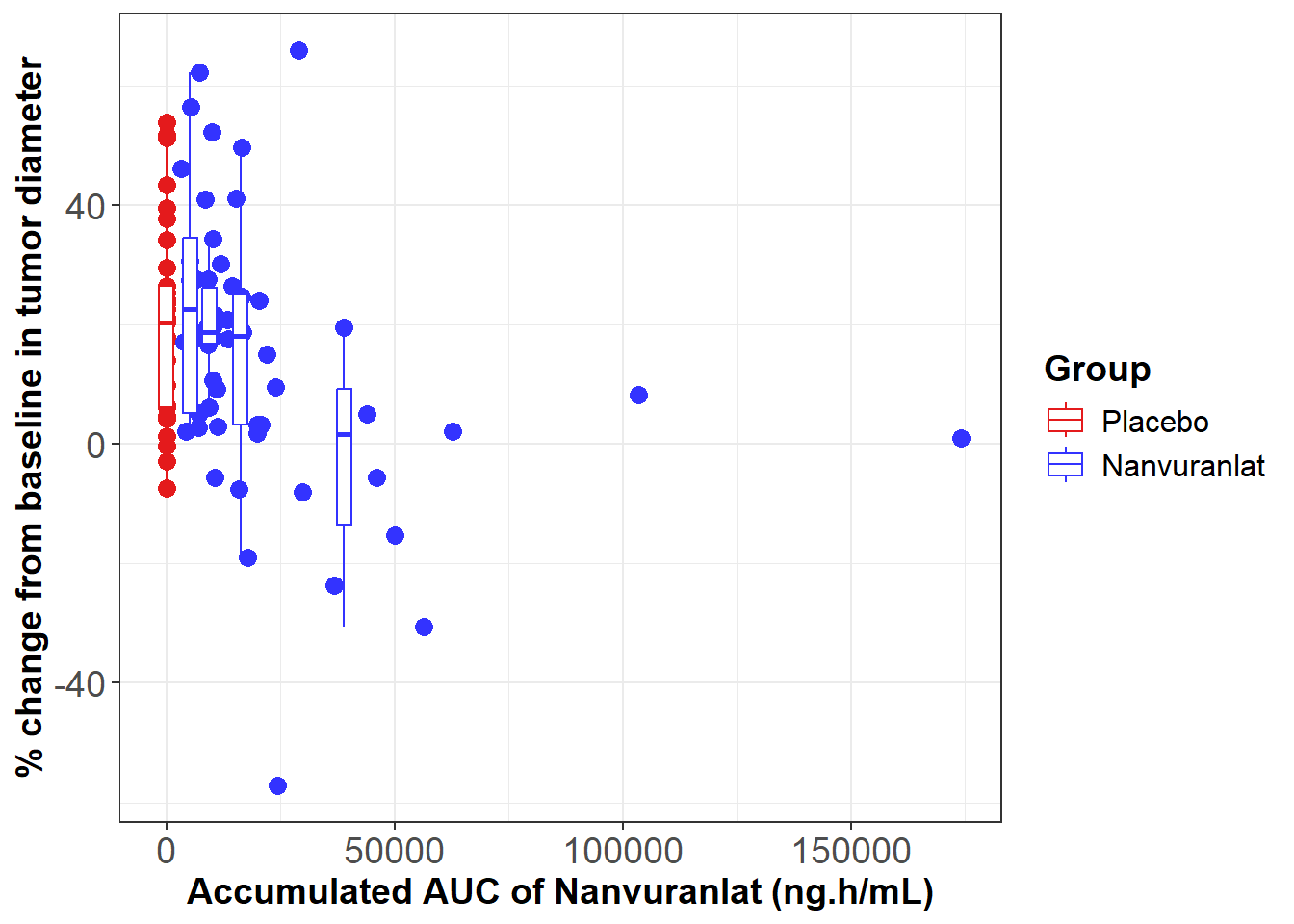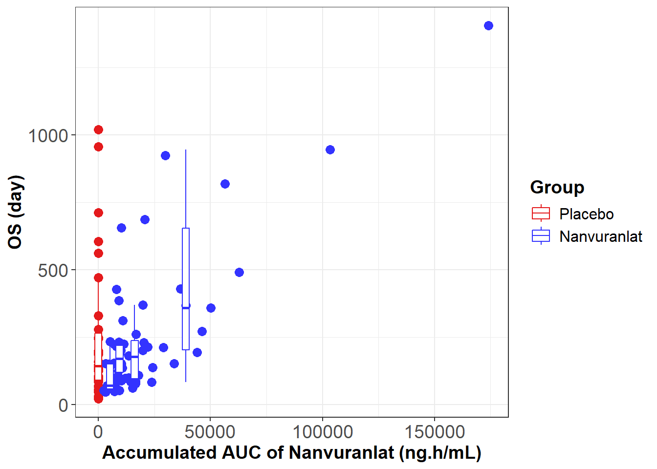 さらに、同ポスター発表では、同試験のデータを用いた暴露-反応解析も紹介されました。これは、薬剤の体内曝露量と有効性の関係を評価する解析であり、その結果、累積暴露量(Accumulated AUC)とOSの間に正の相関が認められました。また、累積暴露量(Accumulated AUC)が大きい程、腫瘍縮小の傾向が見られました。