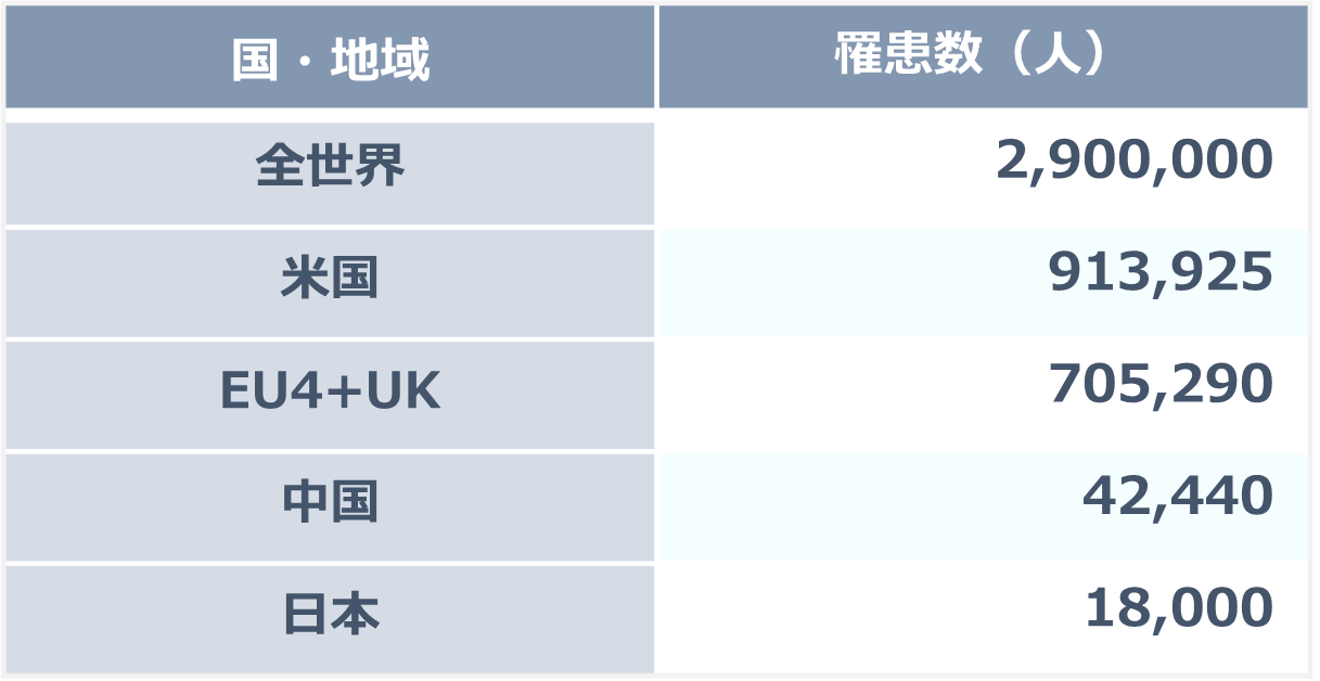多発性硬化症は、若年成人に最も多く見られる慢性の炎症性脱髄性神経疾患であり、厚生労働省の指定難病に含まれております。診断時の平均年齢は32歳と比較的若く、全世界で毎年6万人以上が新たに診断され、現在は約290万人の患者が存在しております。