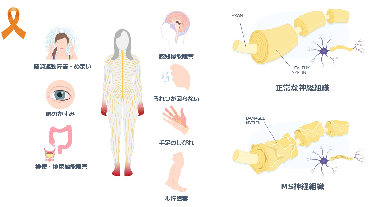本疾患では、免疫反応による炎症により神経細胞の軸索を覆うミエリンが損傷(脱髄)し、その結果、神経信号の伝達が遅延または途絶します。そのため、感覚障害、視覚障害、運動麻痺など多様な神経症状が現れ、患者は四肢の不自由を抱え、車椅子での生活を余儀なくされることも少なくありません。