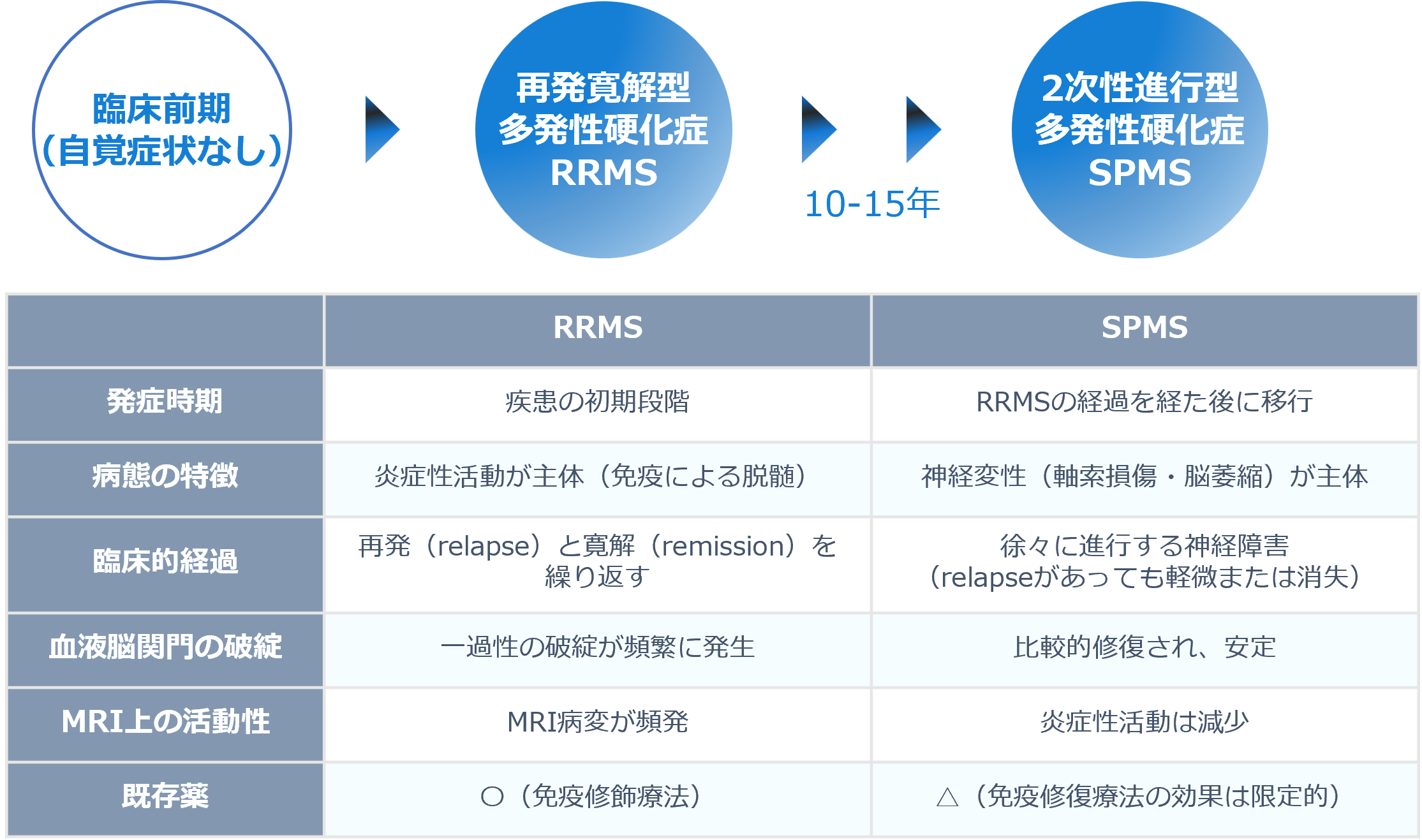 患者の約85%は再発寛解型で発症し、再発期と寛解期を繰り返しながら進行し、10~15年かけて2次性進行型へ移行します。MRI所見(MRIで測定される炎症性病変)は疾患の初期から見られ、MRI所見が生じる際は血液脳関門の機能破綻により末梢の免疫細胞(T細胞・B細胞)が脳内へ侵入し、脱髄と不可逆的な組織損傷を引き起こします。